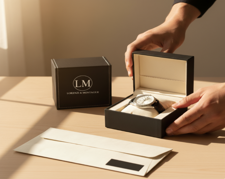 Each timepiece is delivered in a signature Lorenzi & Montague gift box – refined, understated, ready to give or keep.